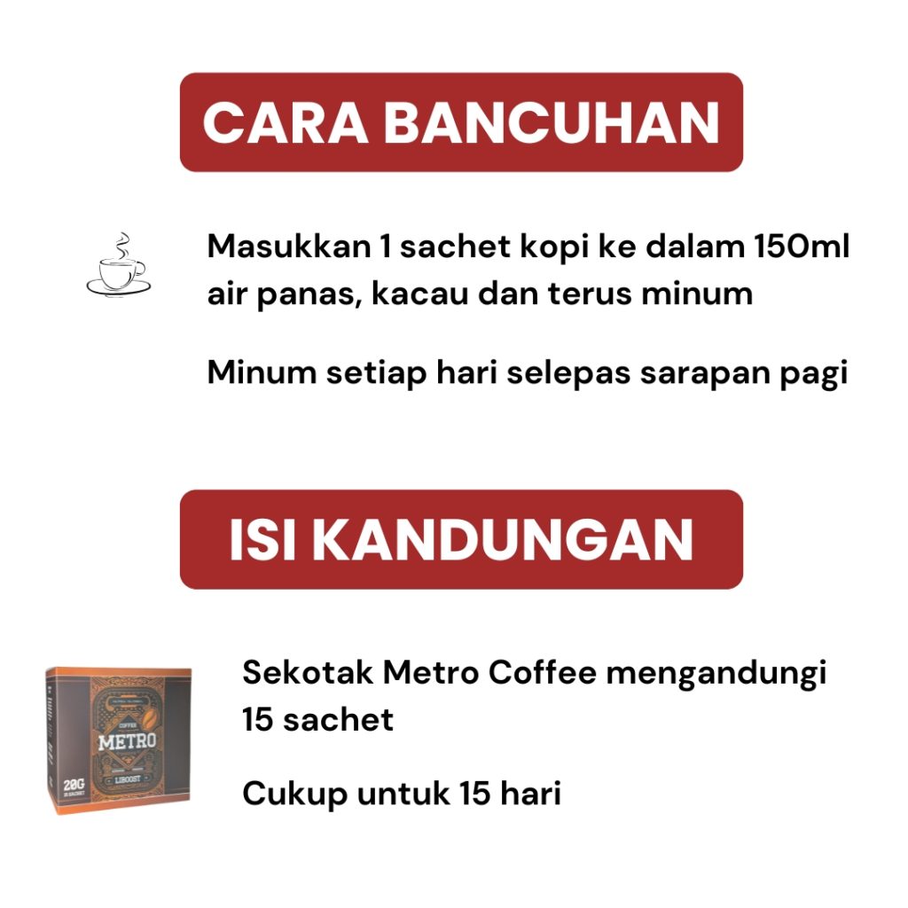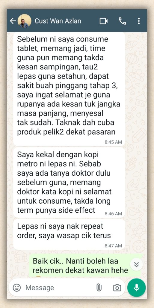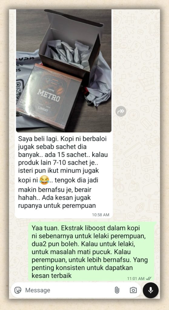 " Memang tak pernah puas main dengan suami sebelum ni sebab dia cepat sangat pancut. Sebab tu saya bagi dia consume Kopi Metro. Kalau nak main sejam tu memang takda masalah. Bagus kopi ni. - Rosmawati, 38, Kerani